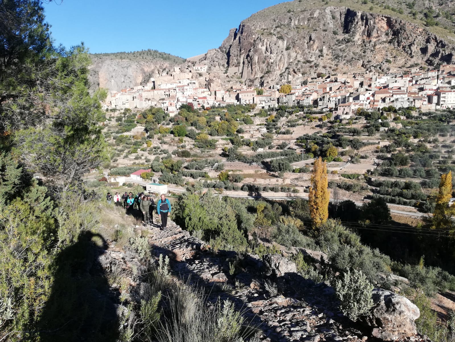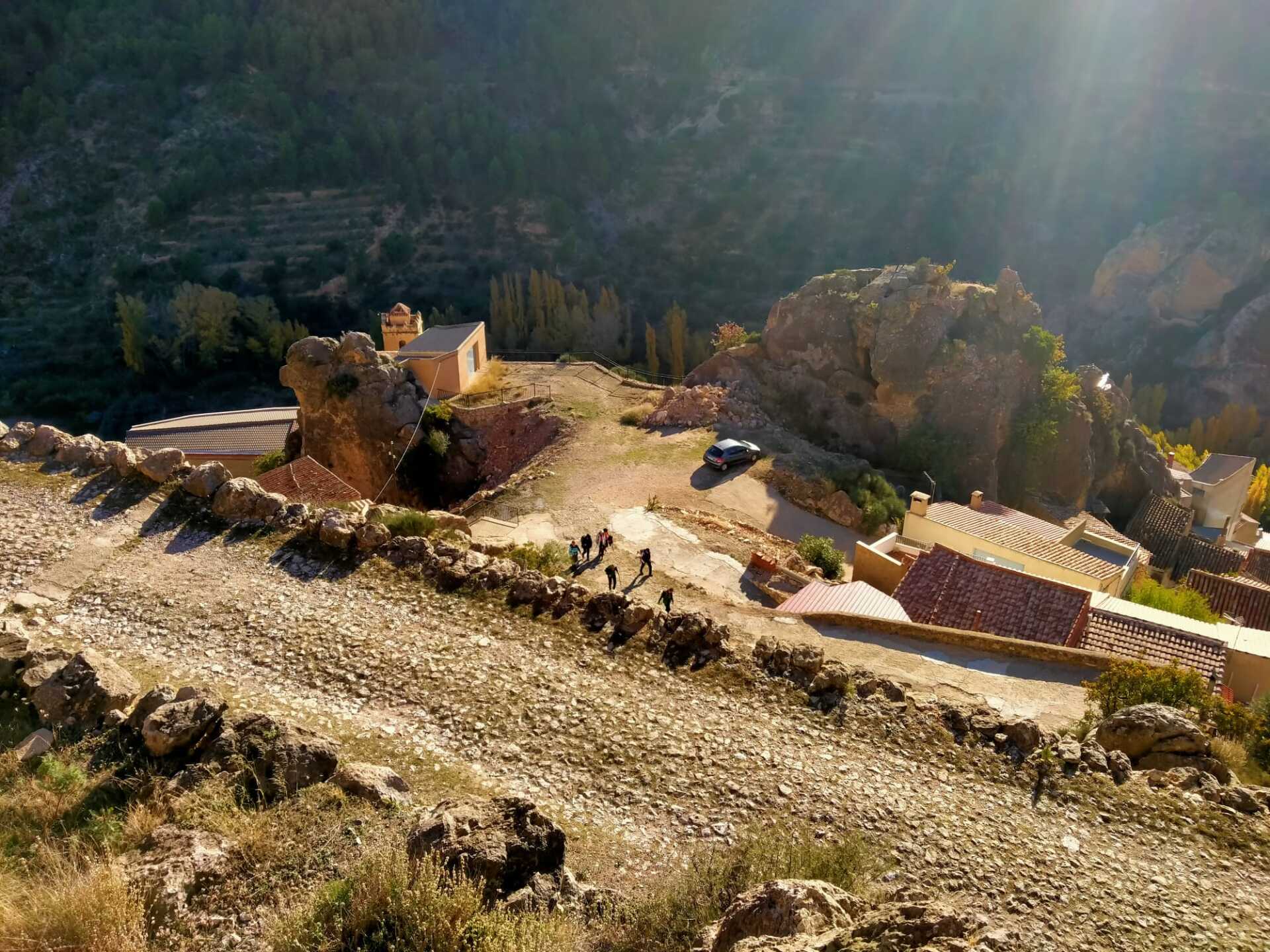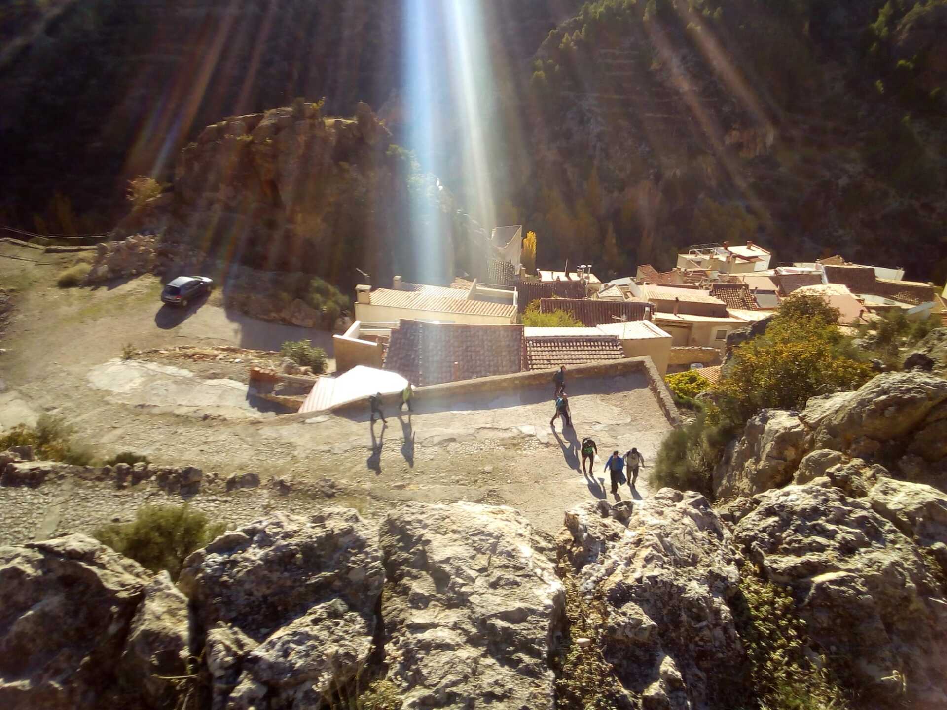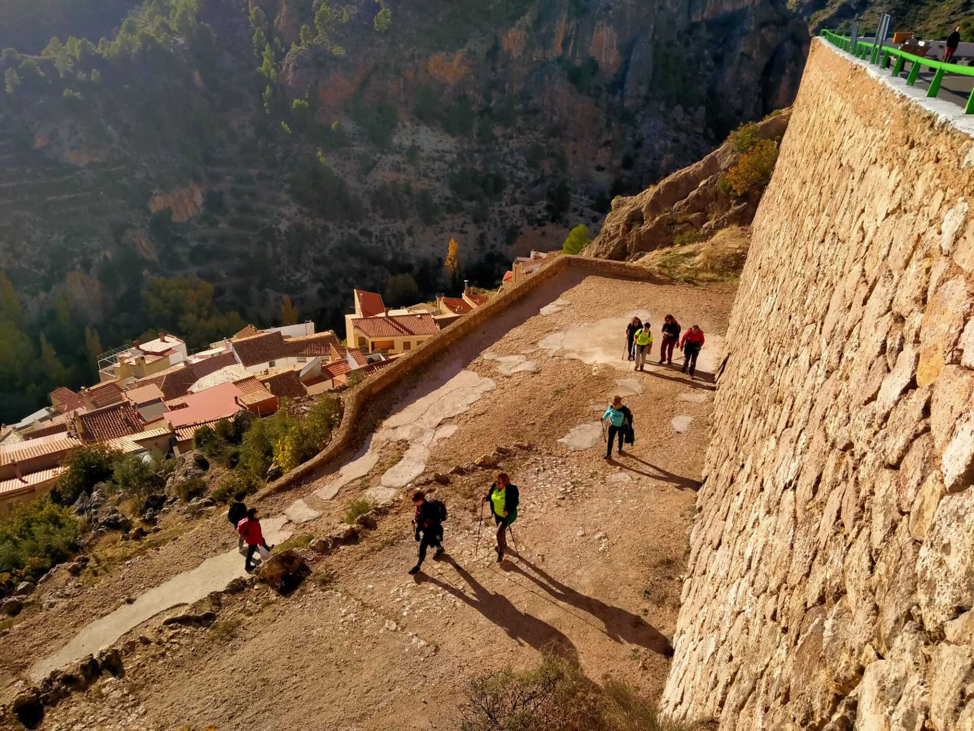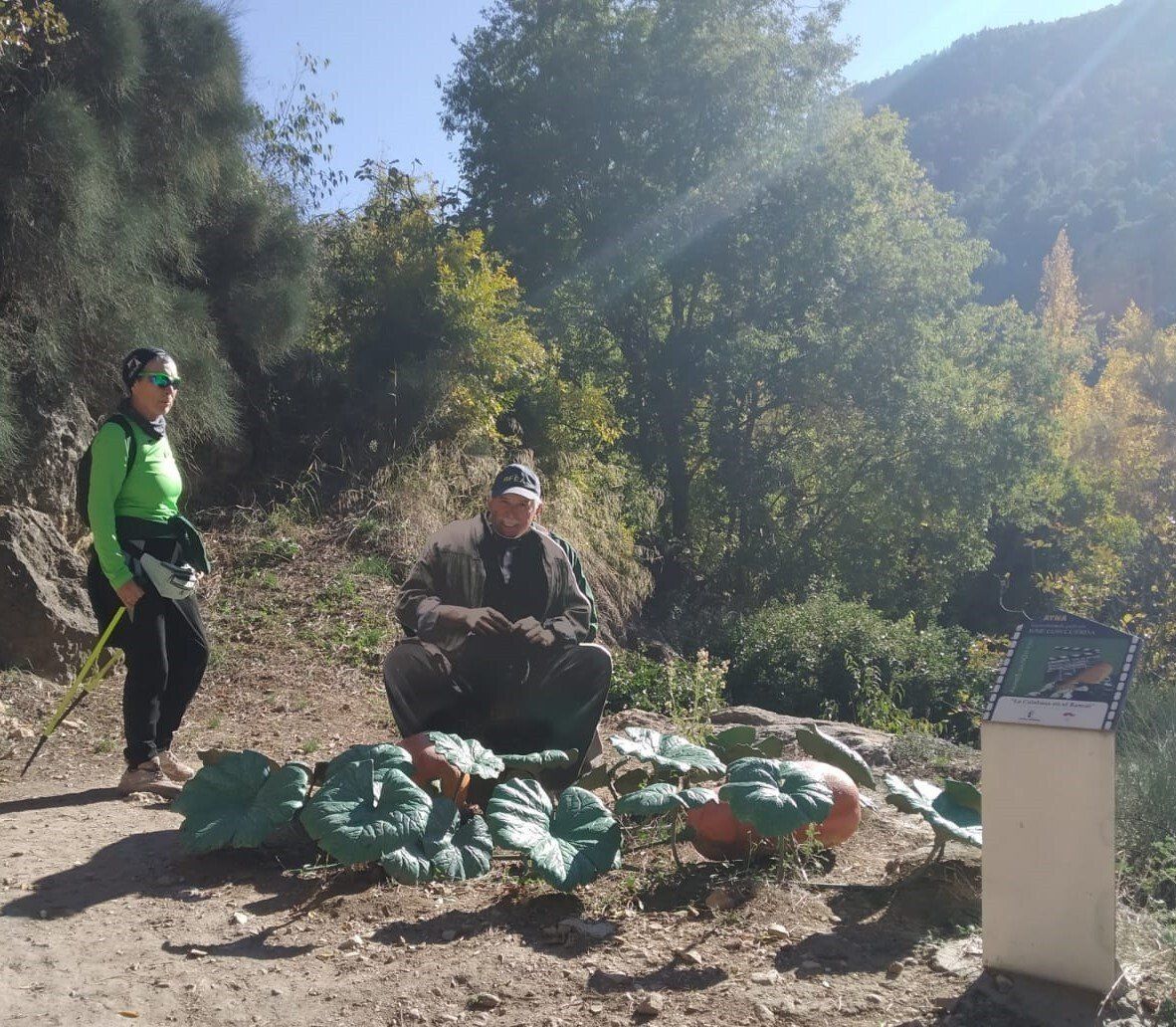 Desde la Plaza Mayor de Ayna, nos esperaban unos 4 kms de continua subida por un sendero de piedras, senda de la Umbría, camino de la Fontezuela, ya con algo de camino descendente hasta el Mirador de los Infiernos, donde asomarse hasta abajo por donde transcurría el curso del río Mundo, te producía un vértigo enorme. En este recorrido disfrutamos de unas vistas espectaculares, del pueblo, del paisaje, de la flora, todo por un estrecho cañón por donde transcurre el río Mundo, conocido también como “La Suiza Manchega”, con espectaculares paredes, donde había numerosos escaladores, y unas vistas y rincones maravillosos.