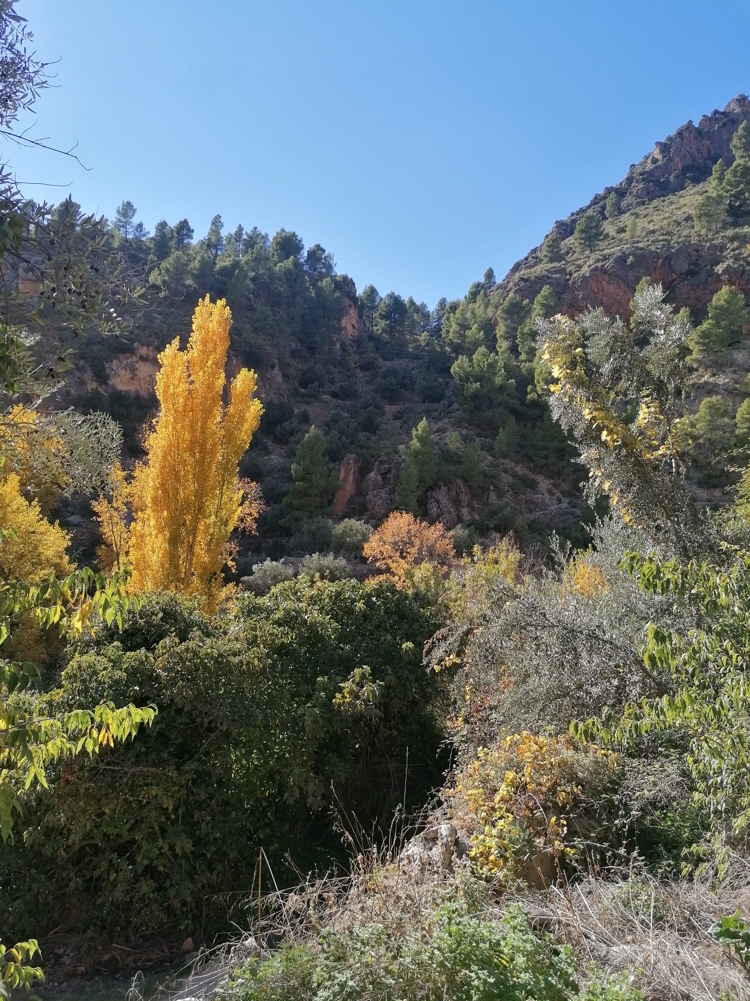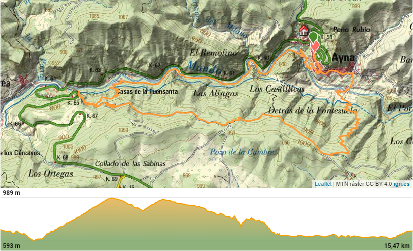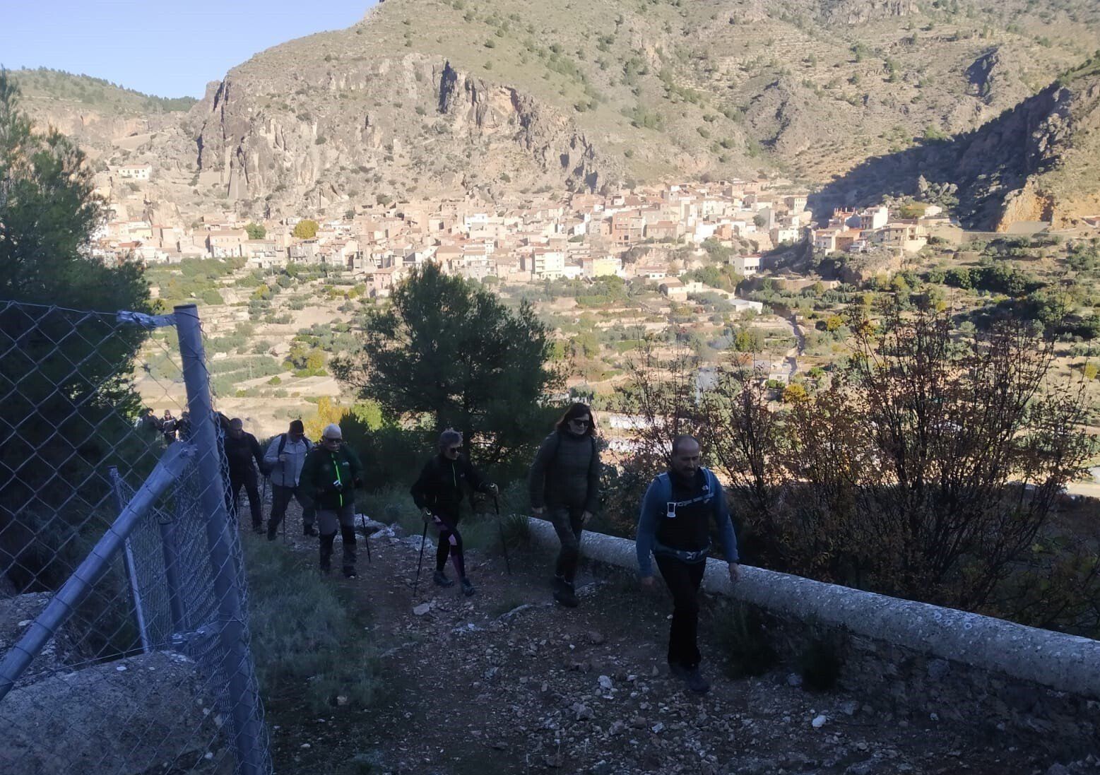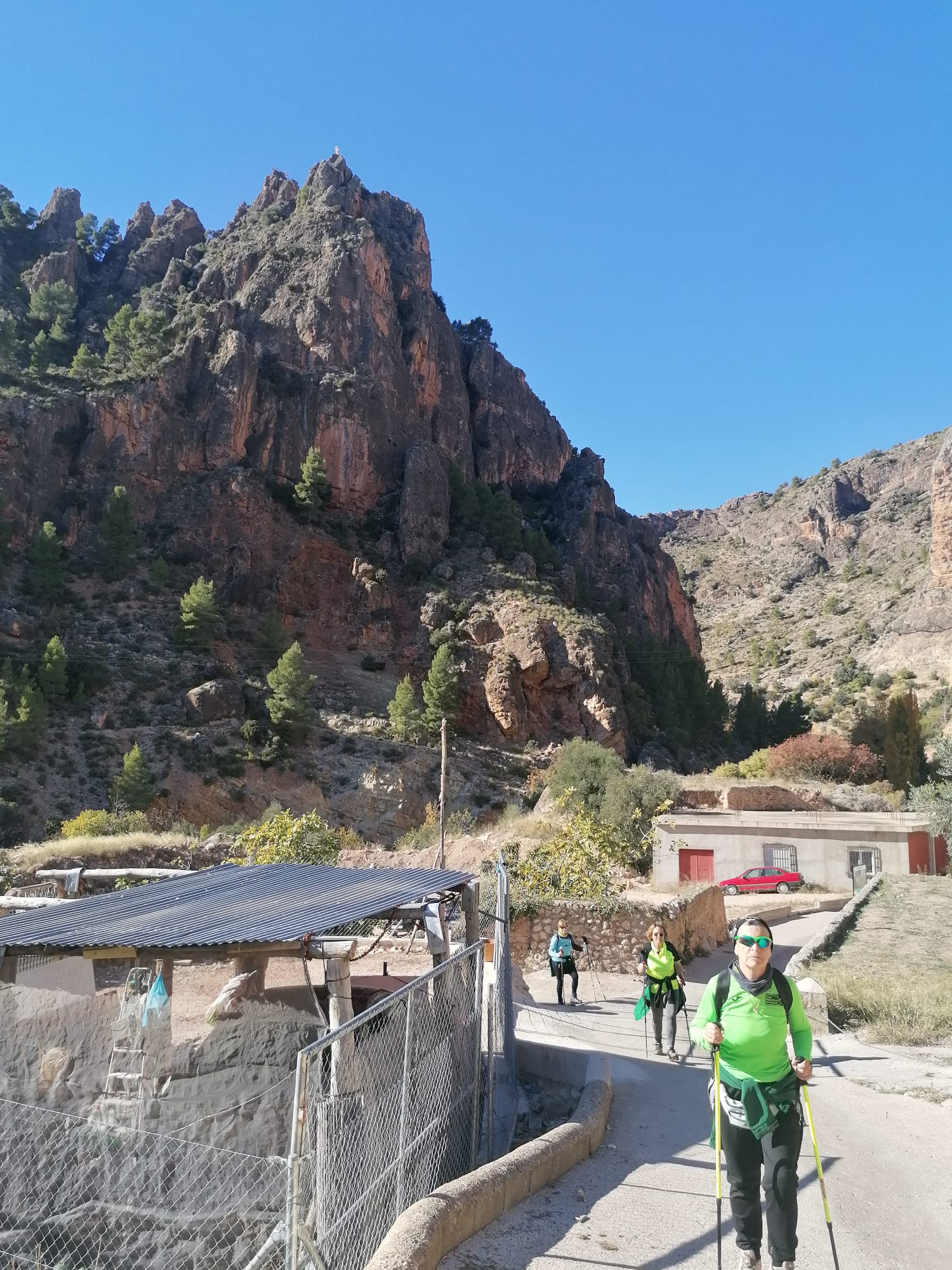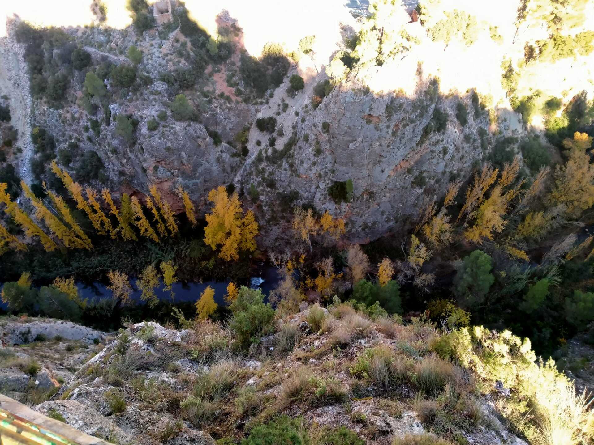 Desde la Plaza Mayor de Ayna, nos esperaban unos 4 kms de continua subida por un sendero de piedras, senda de la Umbría, camino de la Fontezuela, ya con algo de camino descendente hasta el Mirador de los Infiernos, donde asomarse hasta abajo por donde transcurría el curso del río Mundo, te producía un vértigo enorme. En este recorrido disfrutamos de unas vistas espectaculares, del pueblo, del paisaje, de la flora, todo por un estrecho cañón por donde transcurre el río Mundo, conocido también como “La Suiza Manchega”, con espectaculares paredes, donde había numerosos escaladores, y unas vistas y rincones maravillosos.